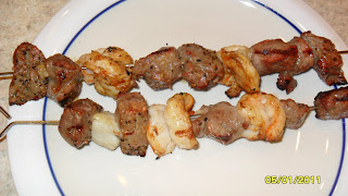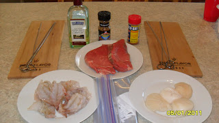 5. Take out the bags of meat and place on skewer shrimp,meat,scallop,meat and repeat till skewer is full.